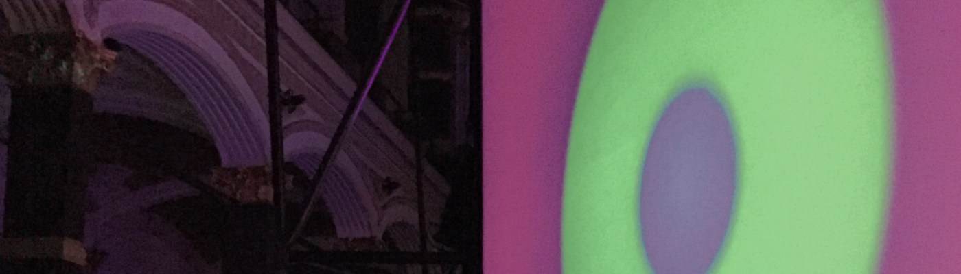 It’s impossible not to face people in the Hexadrome, unless you look up, away from its 7 inwards-facing screens, through a snowflake of black poles and into the dark sky, where you see a few dim shards of colour reflected in the hall’s glass ceiling. Looking up into grey, as clean ambience (reminiscent of Eno’s 1985 record Thursday Afternoon, but with a synthetic lilt) plays in your ears feels good, but it’s obviously secondary; how could you resist looking at those enormous pink, green, orange opals, larger and cleaner and purer than anything else in the city. 7 circle arrangements fade in and out of focus, gently changing in colour. They’re shaped like pupils and retinas, and watched by a hundred or so pairs of eyes underneath.