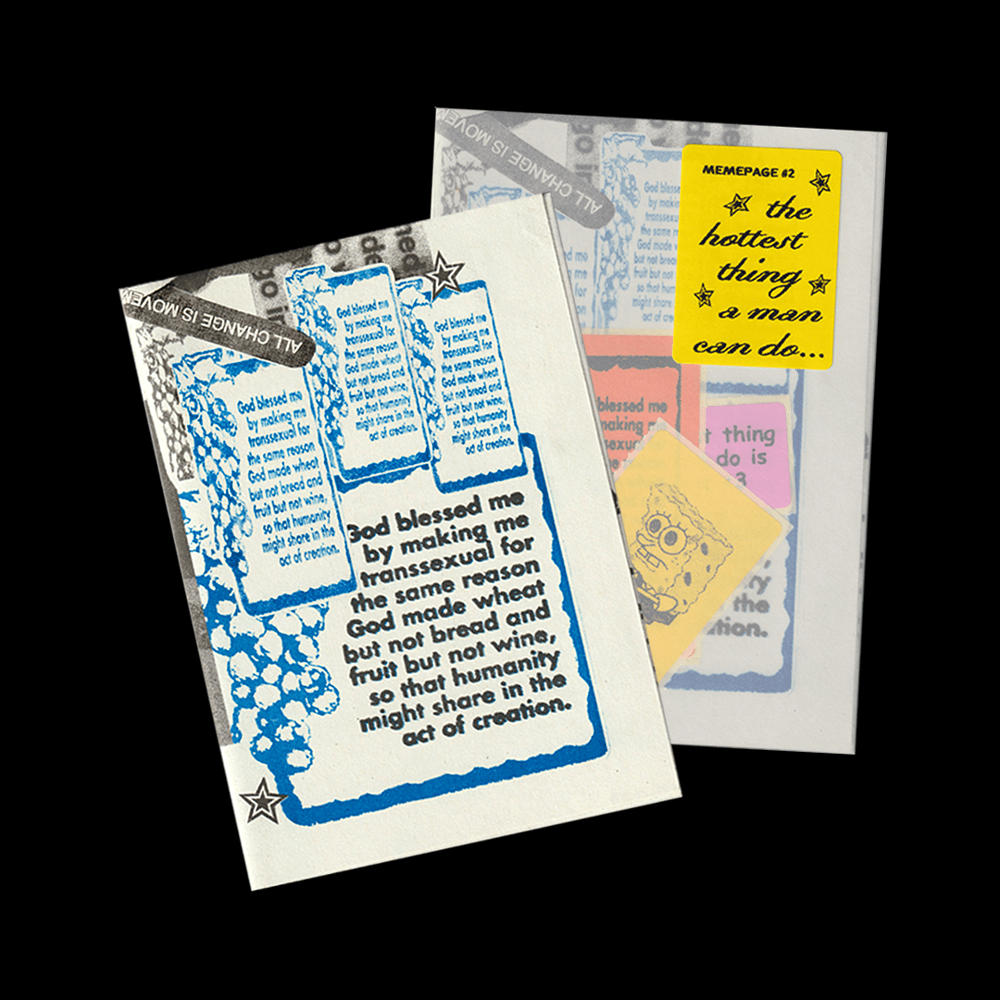 The ‘meme pages’ were packed into tracing paper, and comprised of in-depth interviews with local artists and academics about their relationship to meme culture (printed onto RISO zines), gathered alongside a set of these artists’ chosen memes (printed onto glossy stickers).