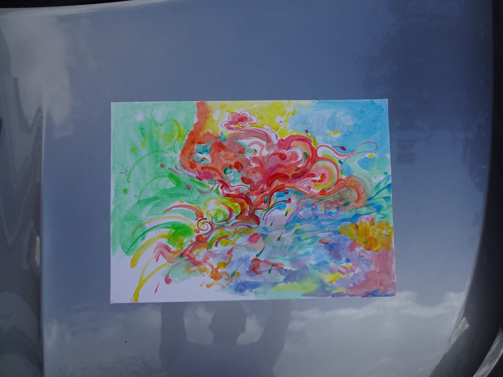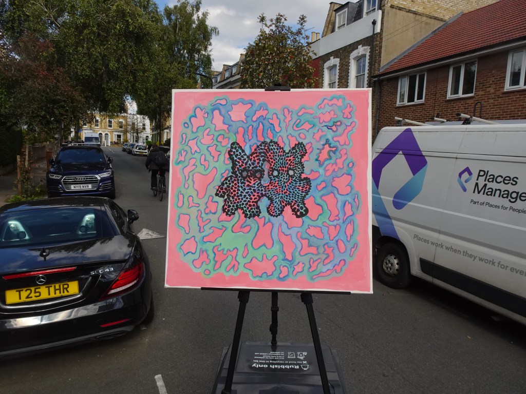 ‘I started with these white rabbits facing eachother, it was just a cute image that popped up in my head because I was happy, summer was coming, but at some point I started to genuinely listen to what was going on and got more comfortable experimenting with the paints, because I’m not primarily a fine artist or anything like that, and as I got more confident trying and got more into the music, I felt very colourful.